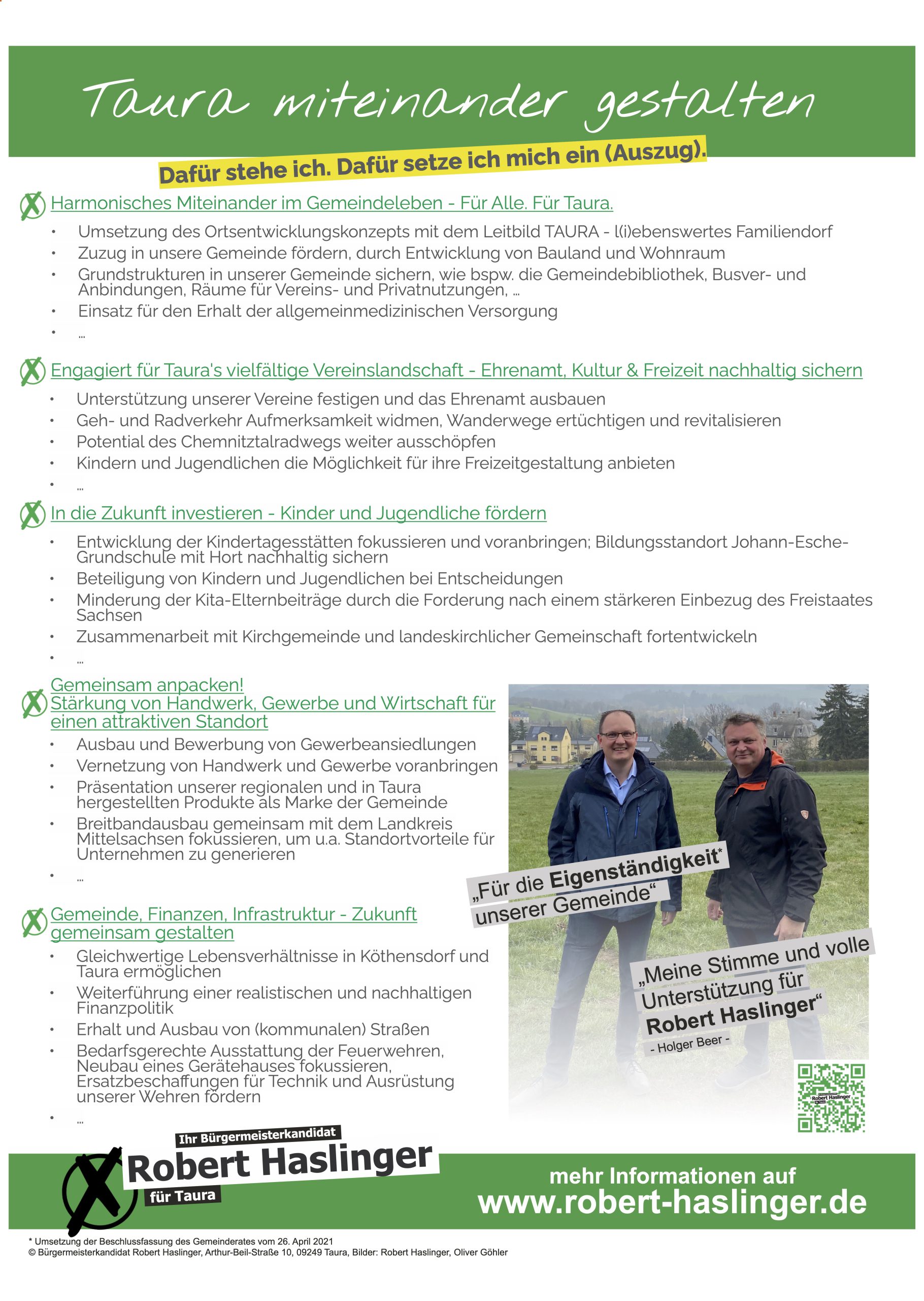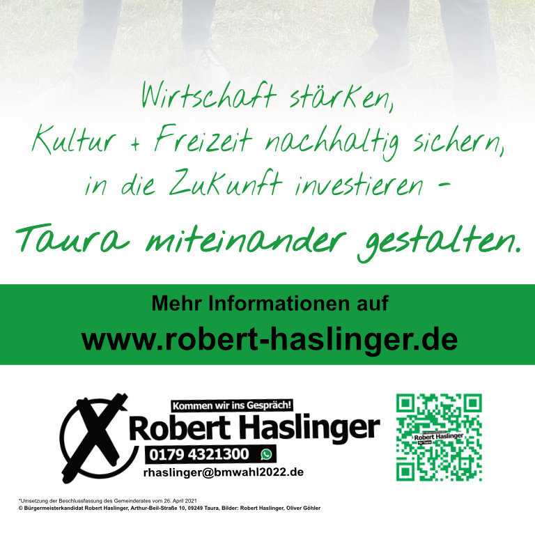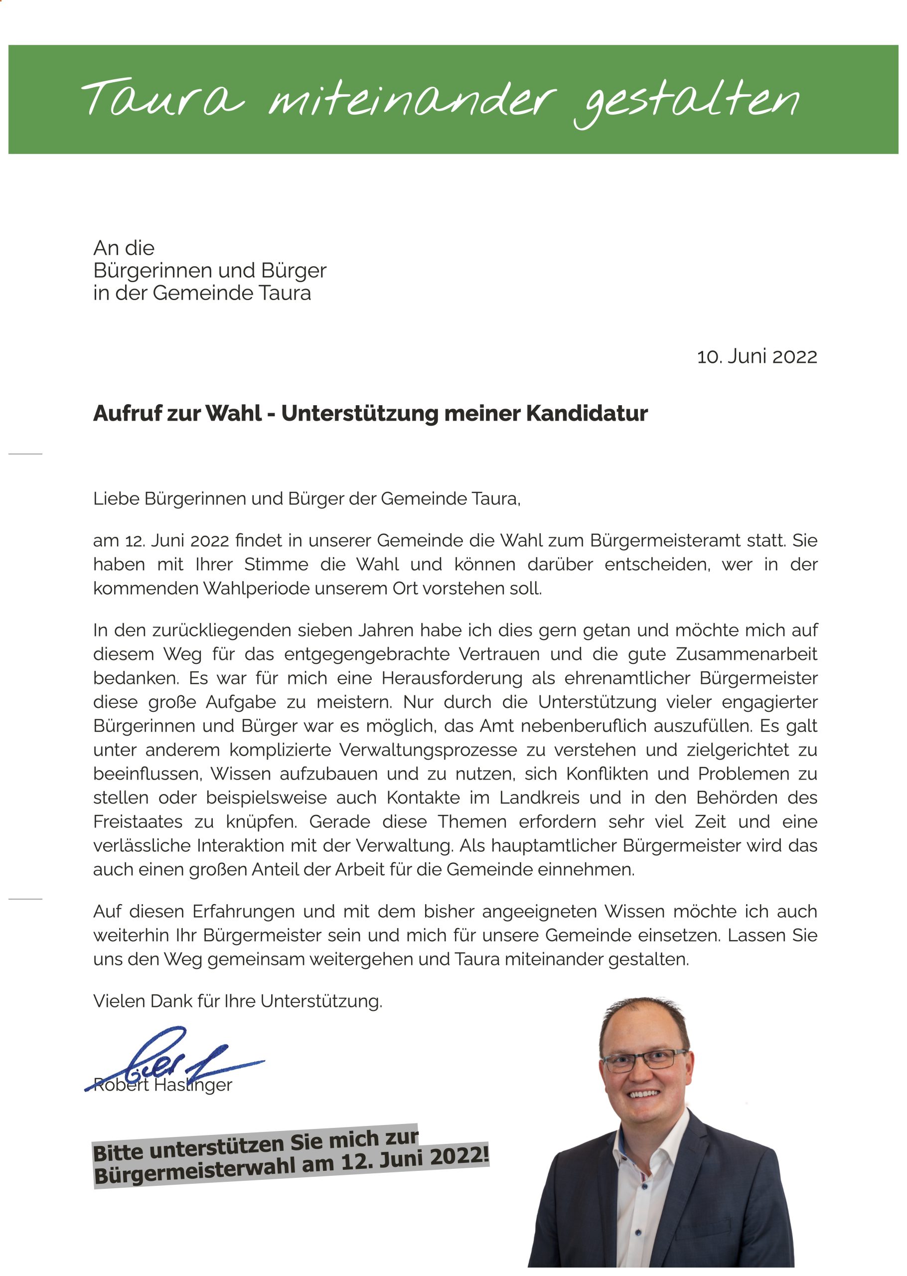 am vergangenen Montag hat der Gemeindewahlausschuss das amtliche Ergebnis der Bürgermeisterwahl in der Gemeinde Taura festgestellt. Mit Ihrer Unterstützung bieten Sie mir die Möglichkeit auch weiterhin als Bürgermeister für die Gemeinde Taura agieren zu können. Vielen Dank für Ihre Wählerstimmen und Ihr Vertrauen!